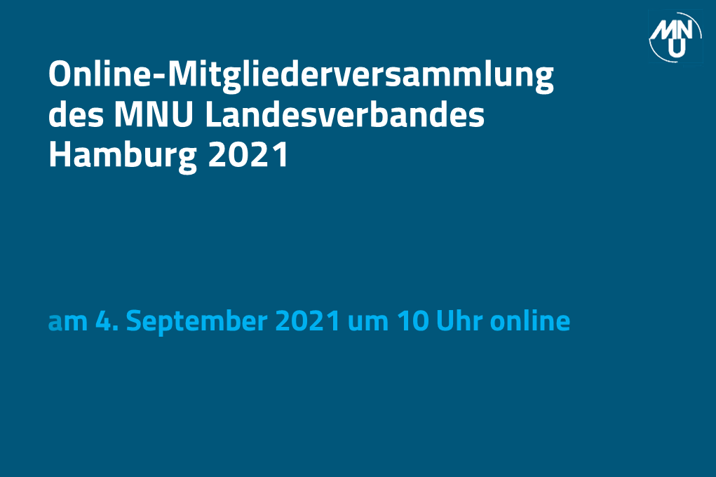 Wir möchten Sie herzlich am Samstag, dem 4. September 2021, um 10 Uhr zur Mitgliederversammlung des MNU Landesverbandes Hamburg einladen.